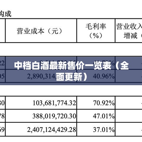 隨著消費升級和白酒市場的日益繁榮,中檔白酒逐漸成為消費者關(guān)注的焦點,對于喜愛白酒的朋友來說,了解最新的中檔白酒售價表格至關(guān)重要,本文將為您呈現(xiàn)中檔白酒售價表格大全,讓您輕松掌握最新市場動態(tài)。